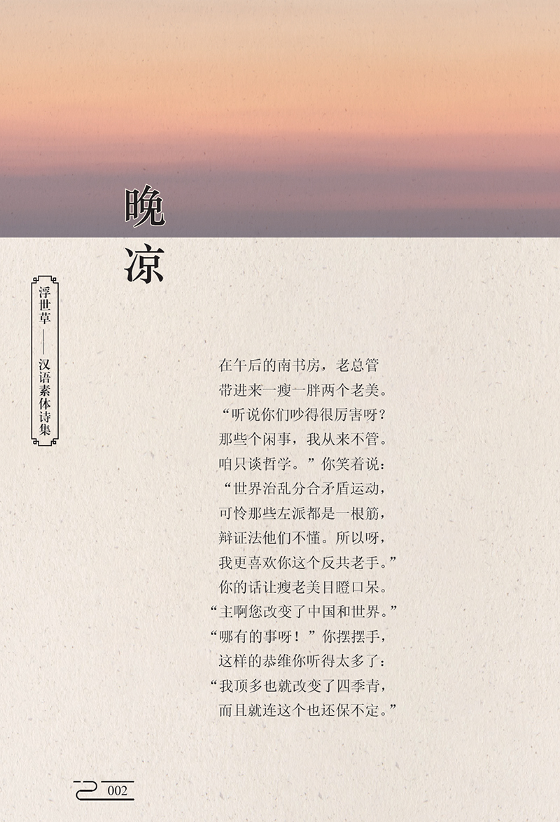 浮世草—— 汉语素体诗集 增订版;目录:晚凉…嘱咐…狮与人…回首归路迷…好人的烦恼…石磺的欣悲…莲的秘密…鲁迅之临末…送别…皈依…伤逝.…出家….祖父…儿孙…风雅颂…神圣的起源…在人间…不朽的传说….树犹如此…思无邪…生灵之音.…热之劫 …牙的告别…爱的再见…-颠倒黄金周…傲骄小生命…老娘亲…