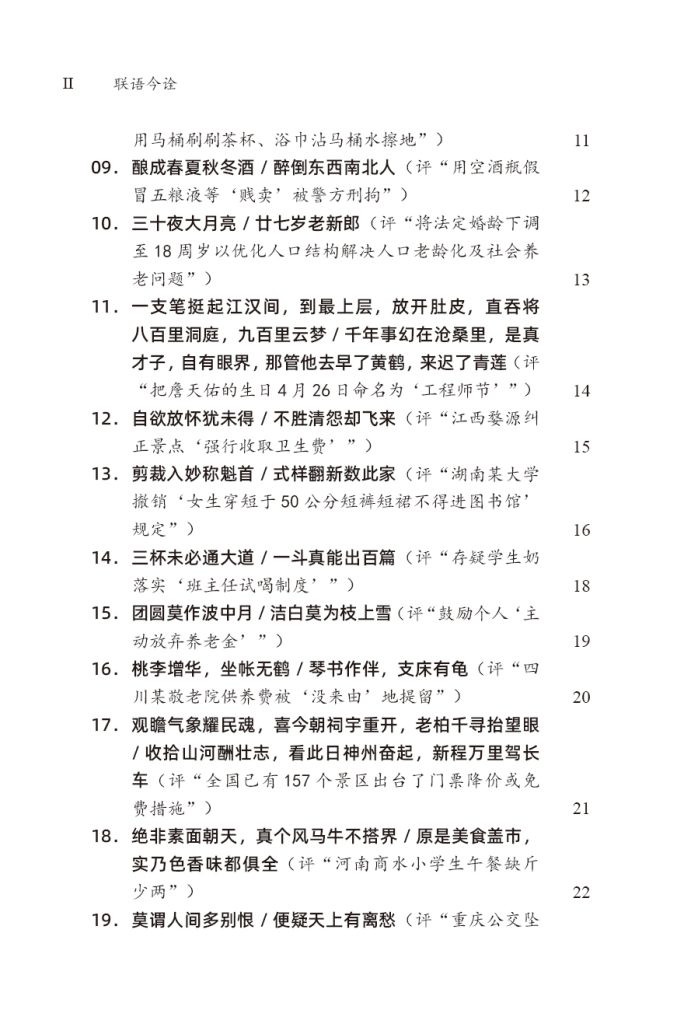 《联语今诠》是《金融时报》文化专版2018年至2019年连载的“联语今诠”栏目的结集。该栏目先后连载百期左右,20多万字,引用古今著名联语近300副,涉及两年间主要的文化热点与社会新闻。获得第33届中国产经新闻奖(中国新闻奖初评)新闻专栏奖。
