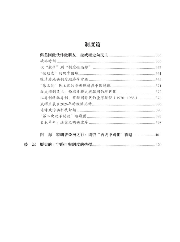 中美關係的惡化並非不可逆轉的歷史宿命,但轉機的鑰匙不在於戰術層面的策略調整,而在於戰略層面的制度抉擇。正如本書反復強調的,在21世紀的十字路口,選擇對抗還是合作,選擇封閉還是開放,選擇固守威權還是擁抱民主,這不僅決定著兩個大國的國運興衰,更將深刻重塑人類文明的走向。